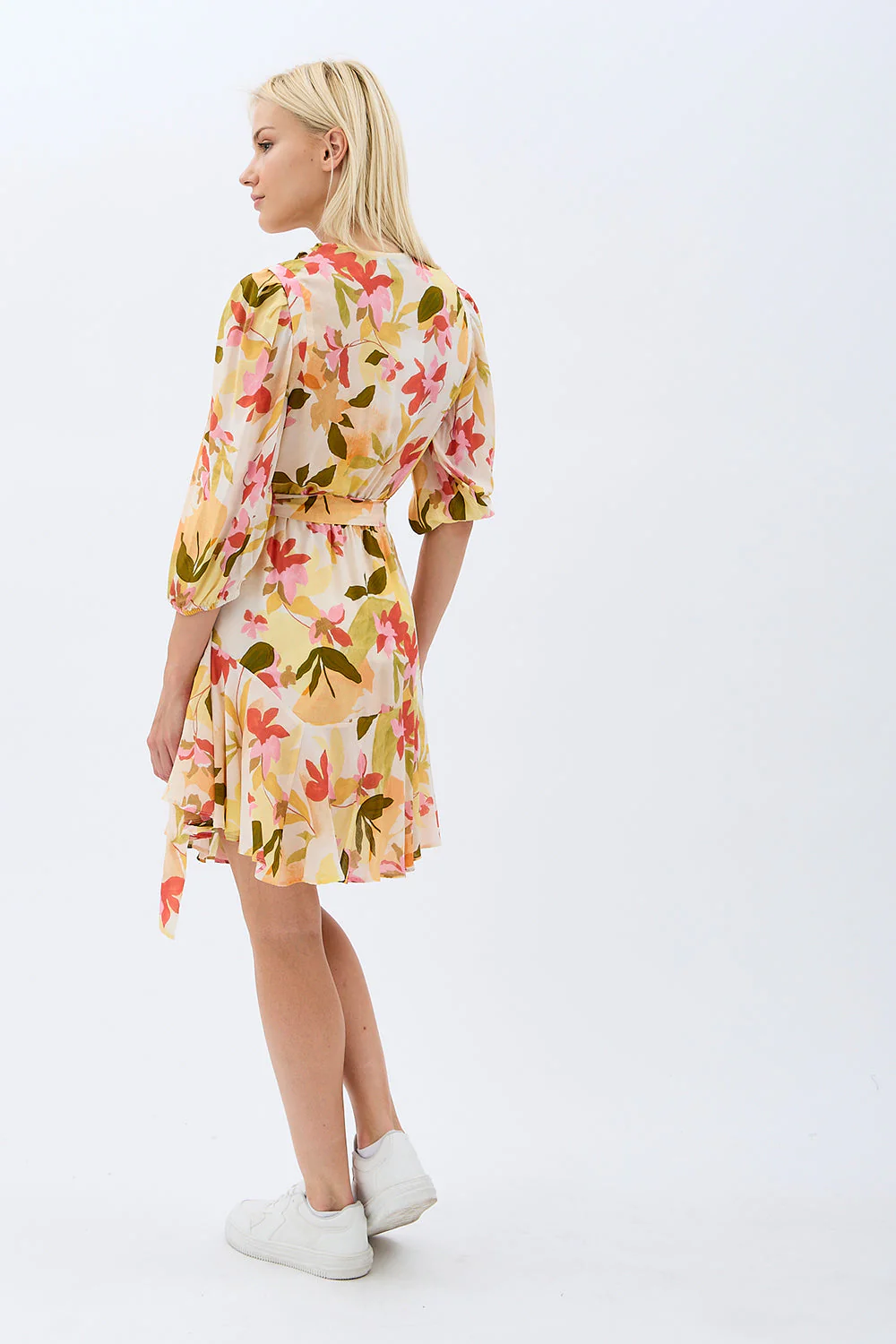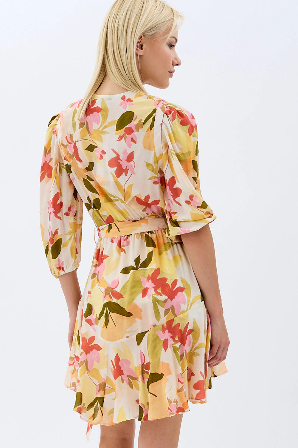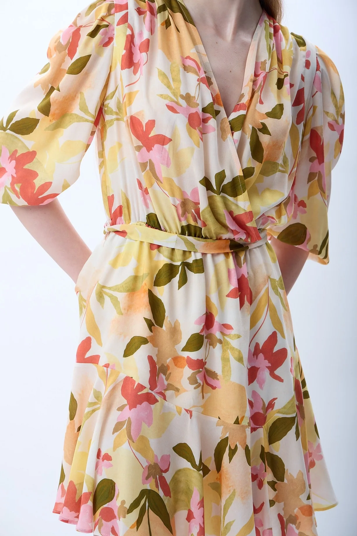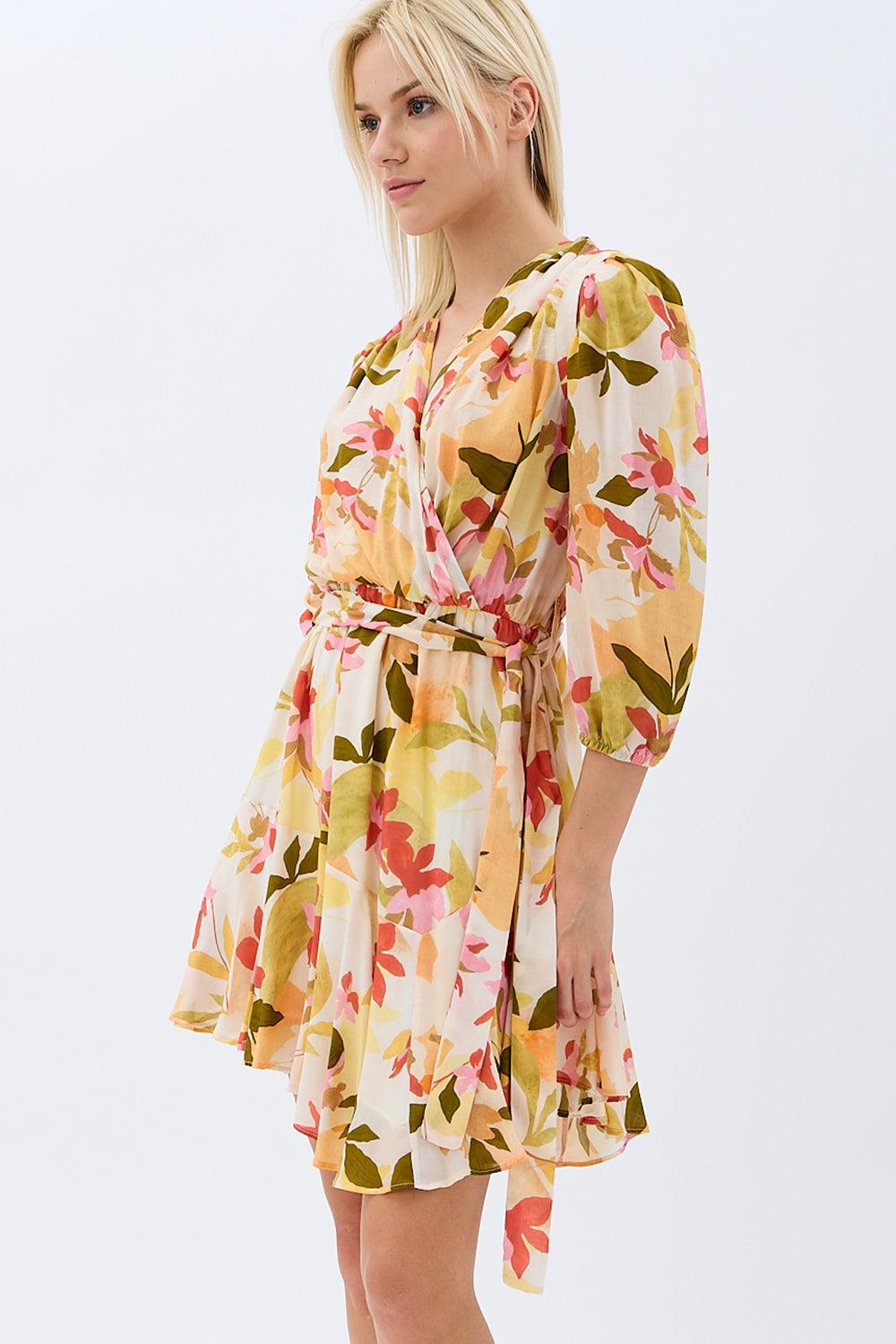 DIAGONAL SARI ÇİÇEKLİ ELBİSE