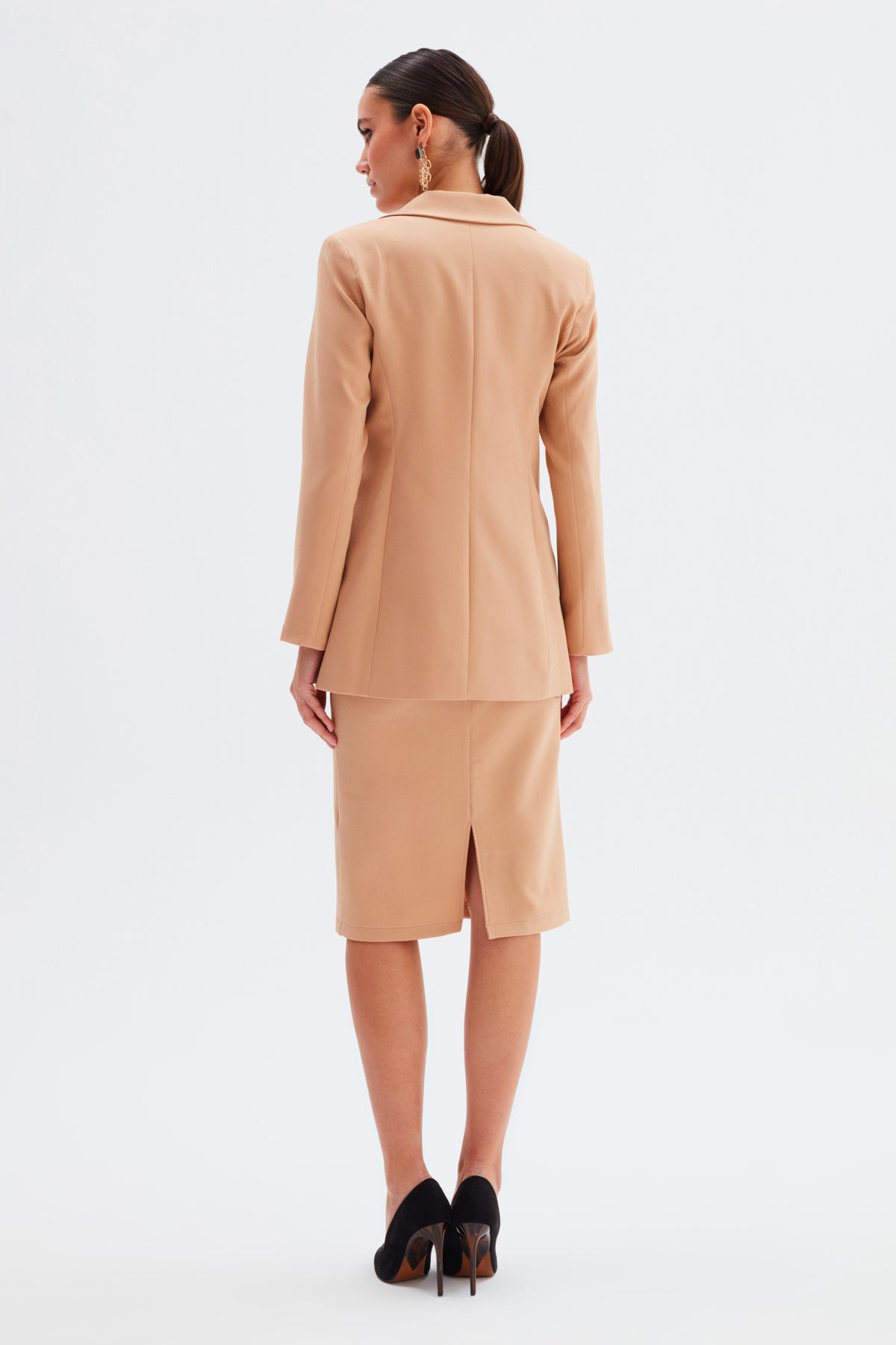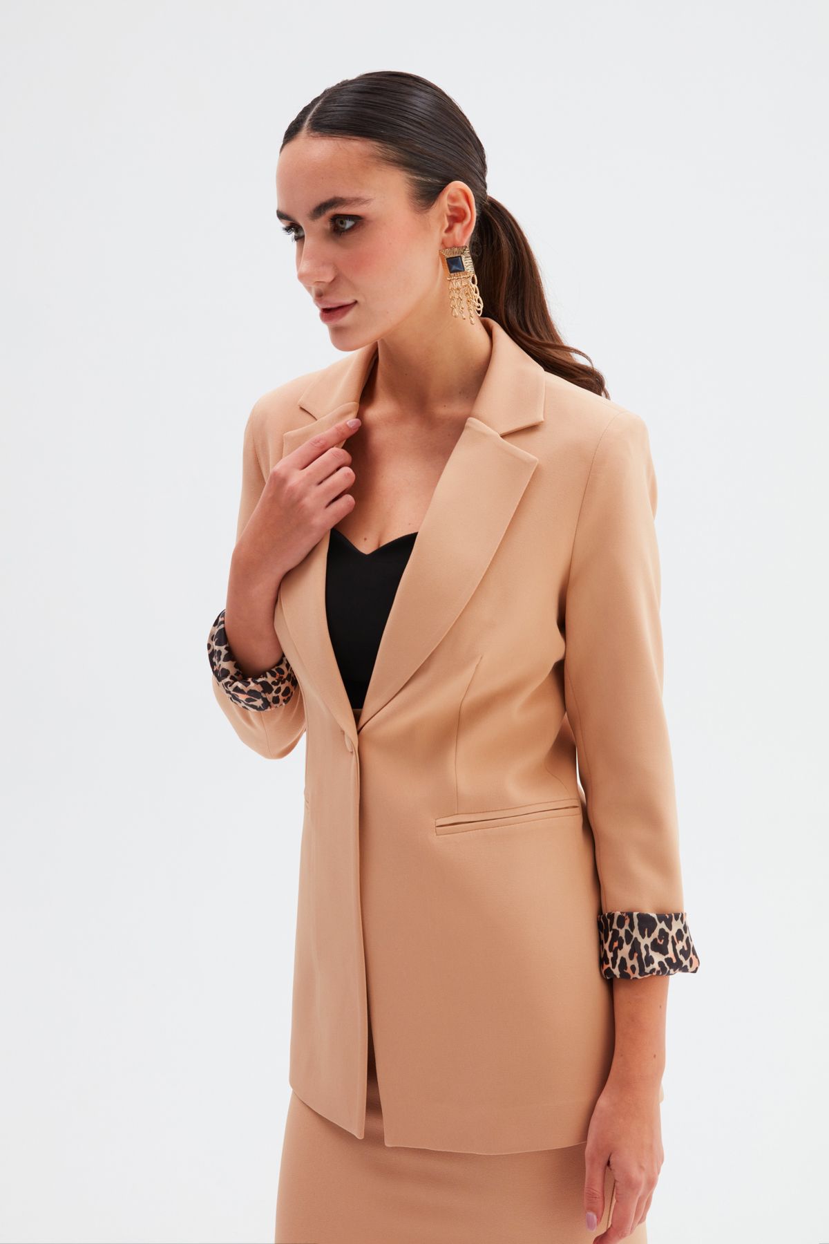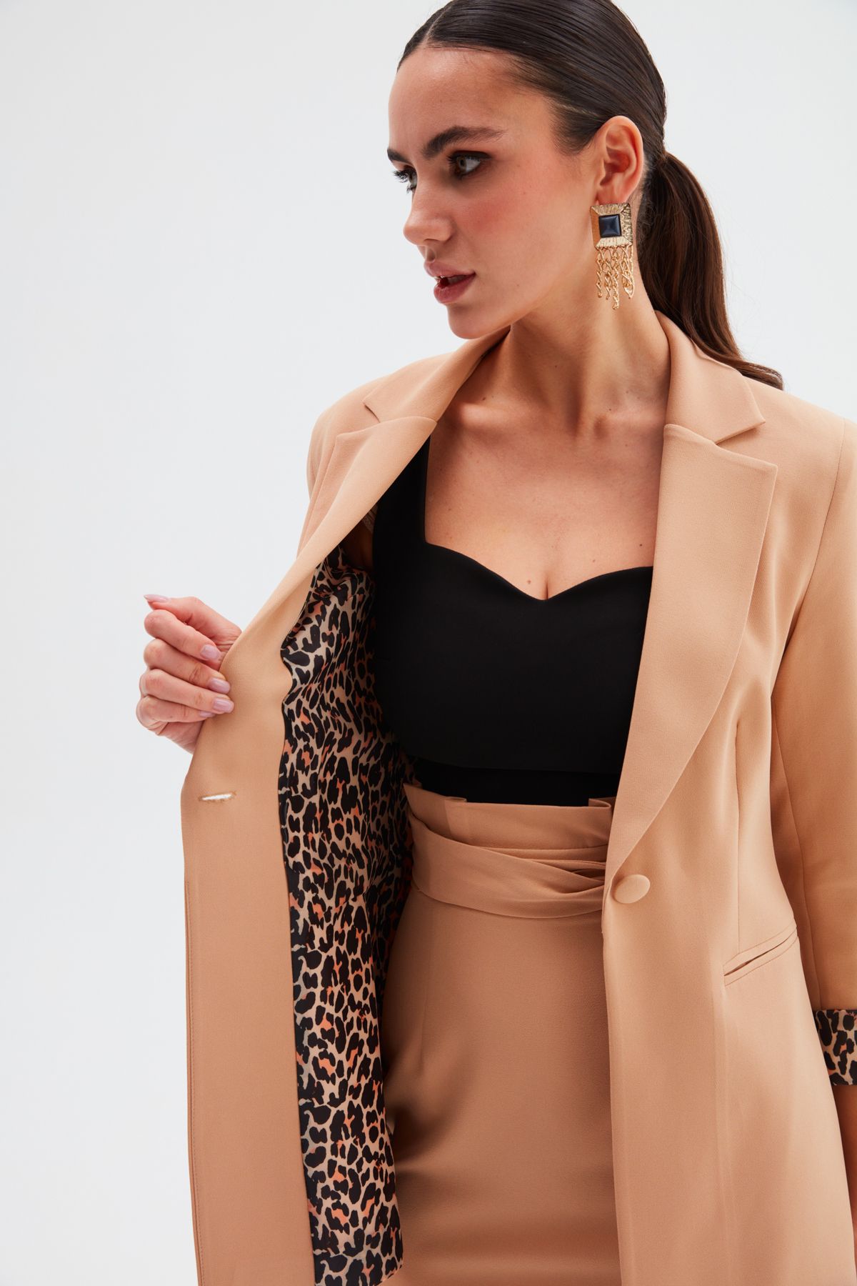 SATEEN İC LEOPAR DETAYLI CAMEL CEKET